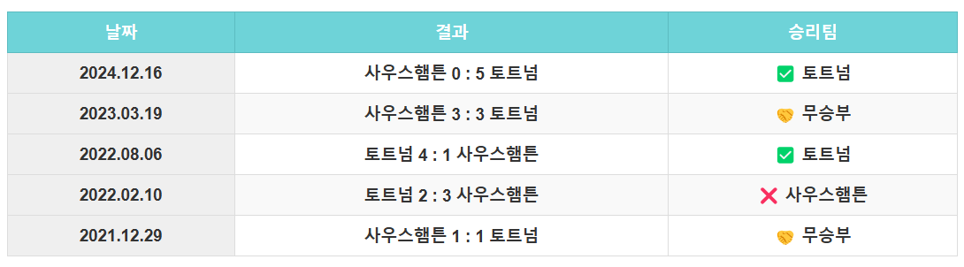 - 평균 실점: 토트넘 1.48 / 사우스햄튼 2.37