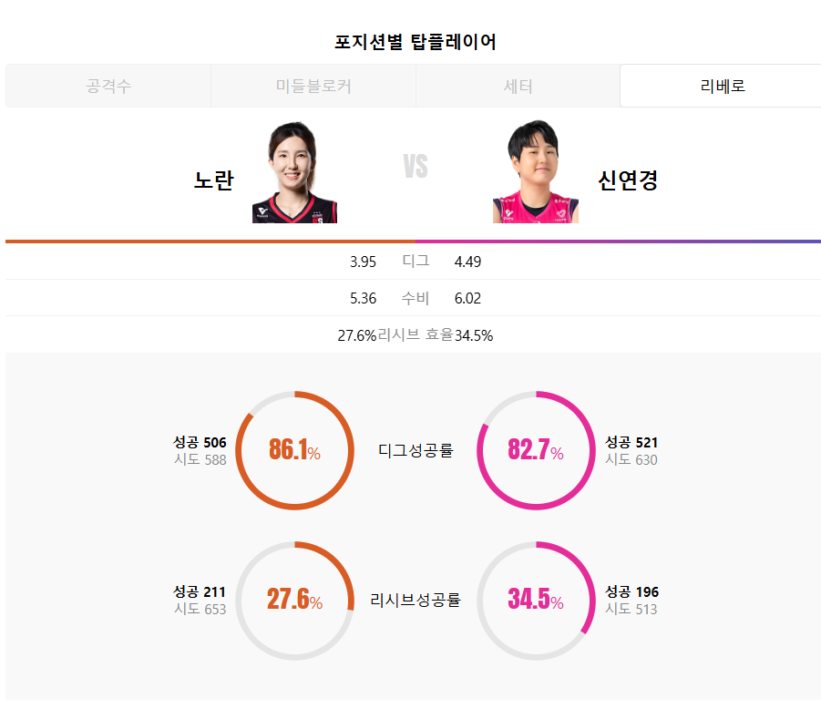 - 리베로: 노란(정관장) vs 신연경(흥국생명)