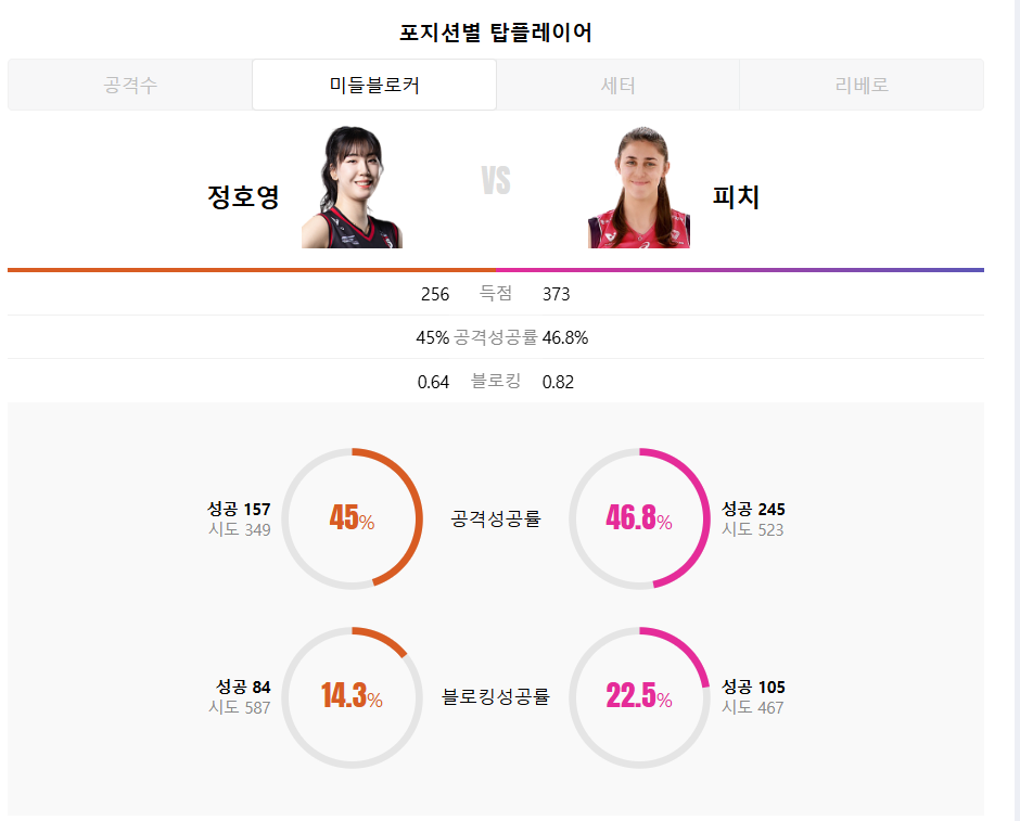 - 흥국생명 피치: 373 득점, 블로킹 성공률 22.5%