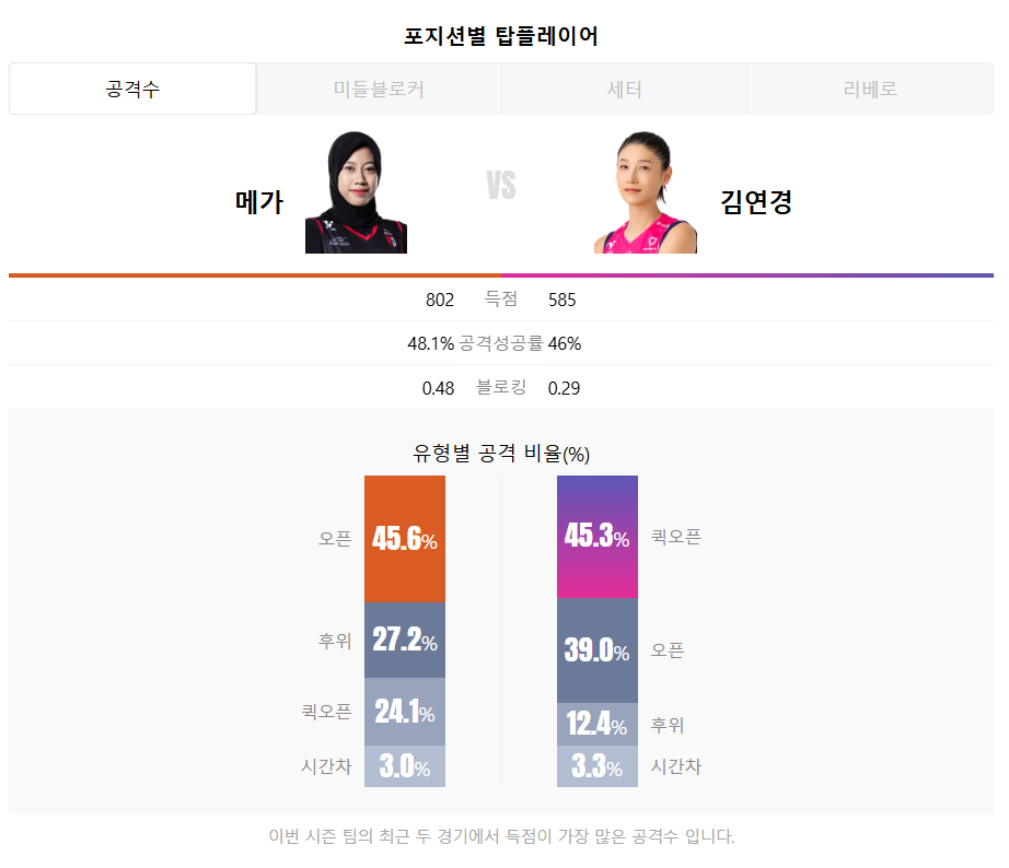 ‘공격 유형’에서도 메가(오픈), 김연경(퀵오픈)이라는 차별화된 스타일이 관전 포인트입니다.