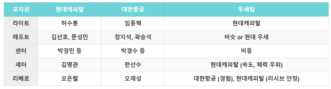 현대캐피탈 vs 대한항공, 포지션별 전력 총정리