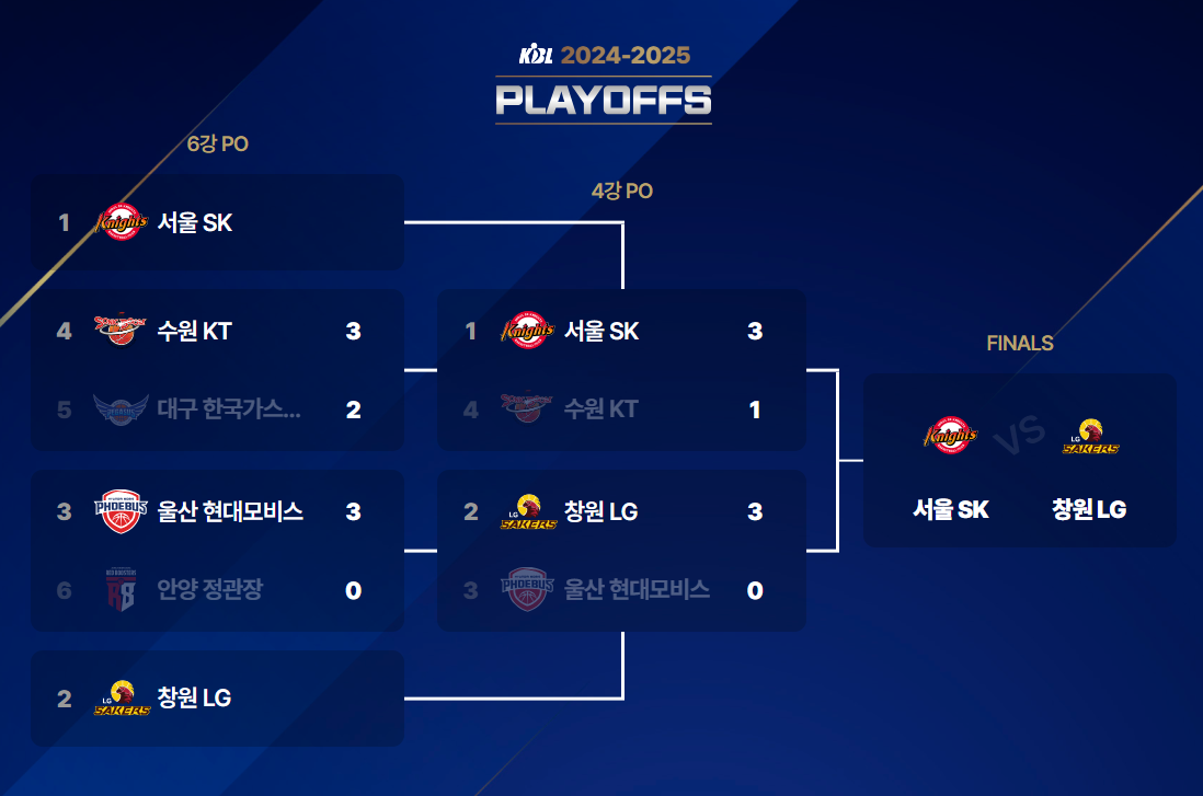 SK는 수원 KT를 3승 1패로 제압, LG는 현대모비스를 3전 전승으로 스윕.